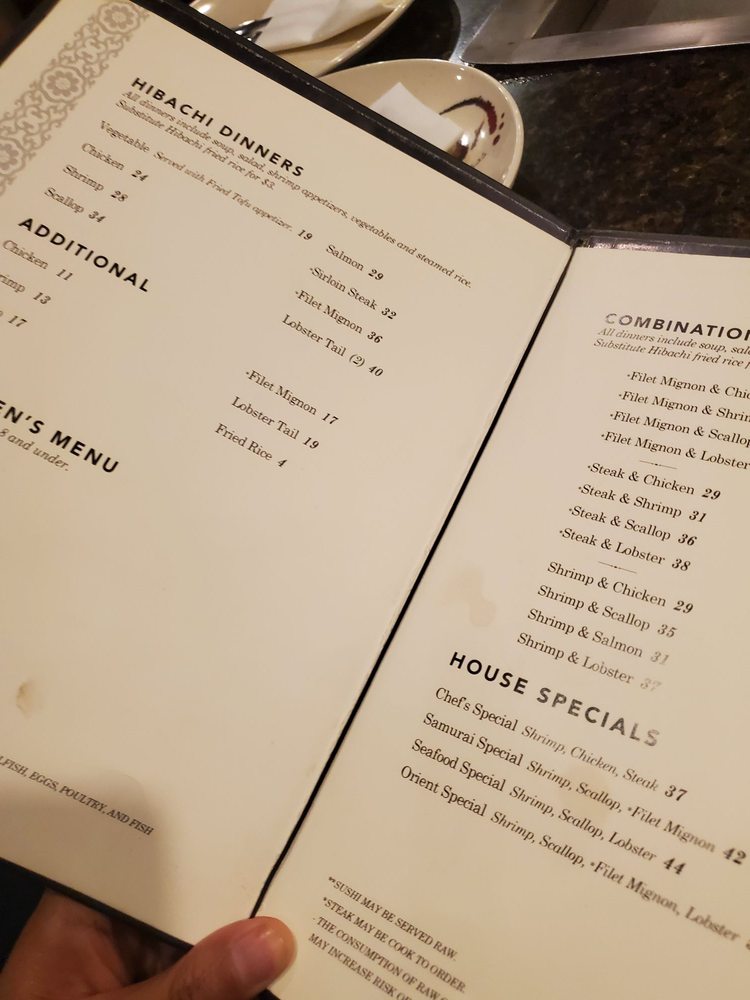 Combination of Shrimp, Chicken and Steak with carrots, broccoli, onions, zucchini and mushrooms on the side - soup and salad included